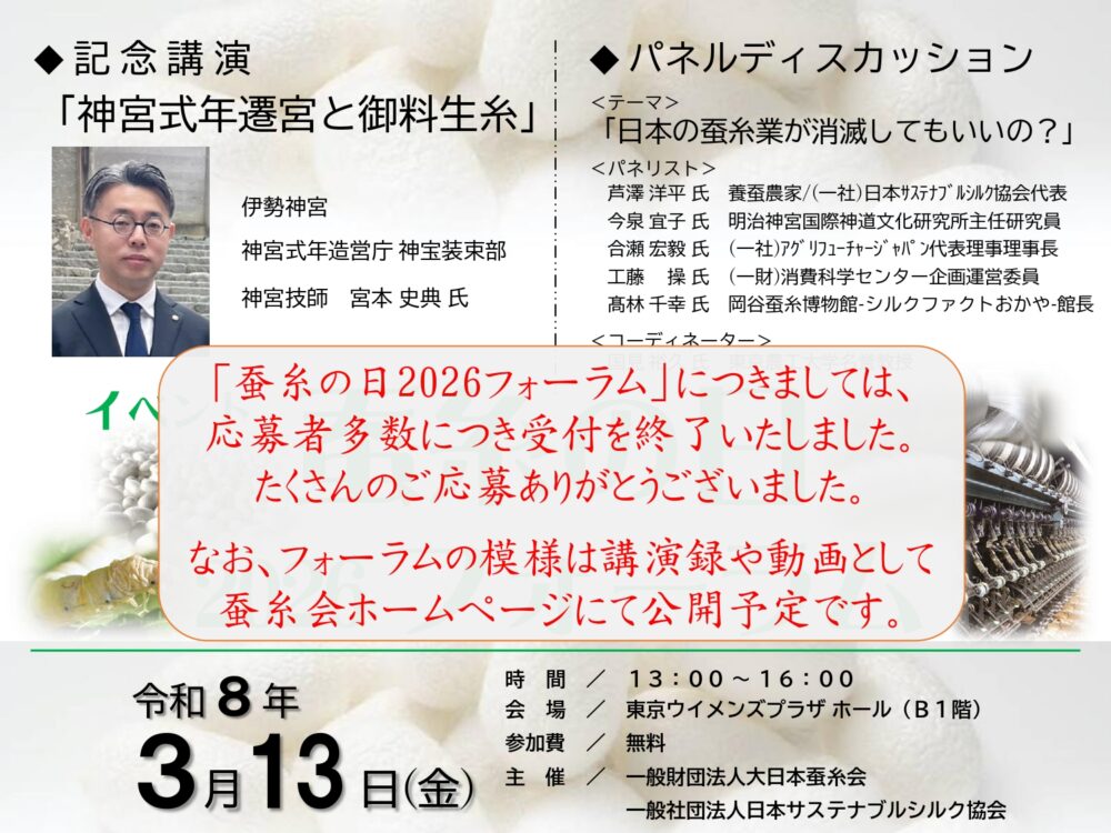 「蚕糸の日2026フォーラム」につきましては、応募者多数につき受付を終了いたしました。たくさんのご応募ありがとうございました。