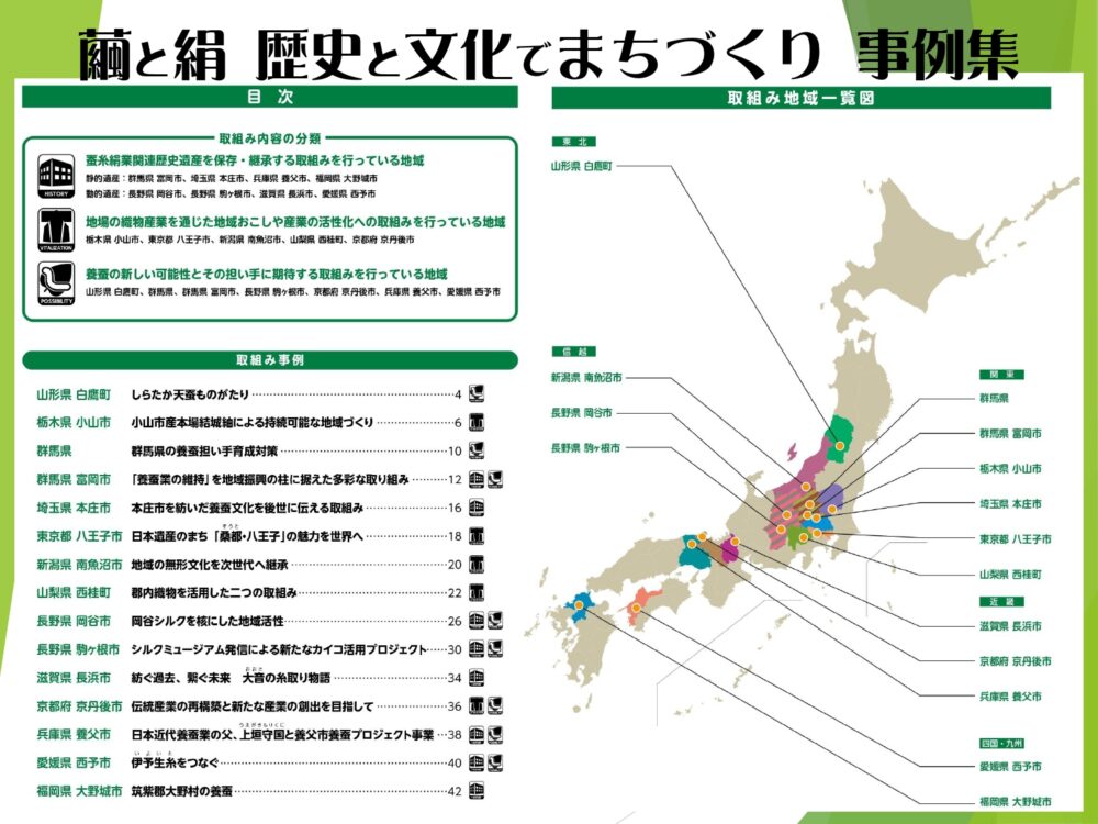 蚕糸会では、全国各地に残された蚕糸業を核としたまちづくりの取組みを、事例集「繭と絹 歴史と文化でまちづくり」としてまとめました。